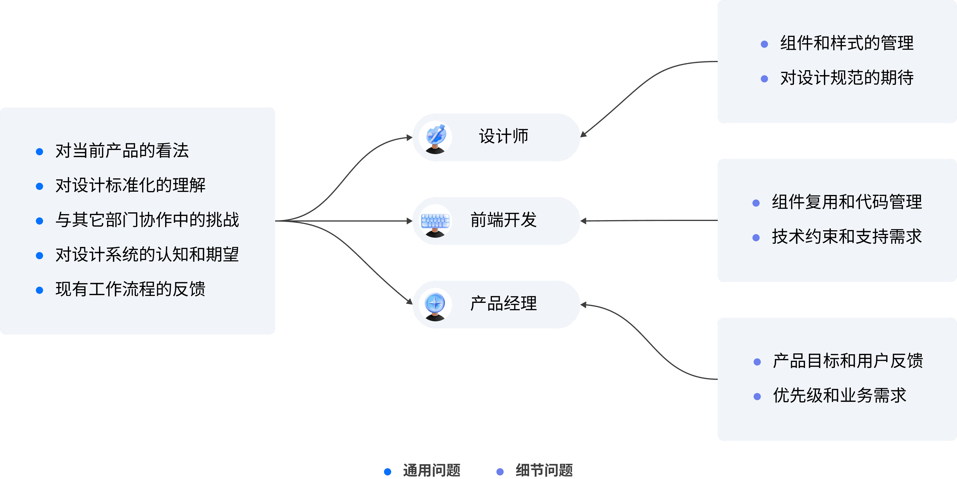 为了收集主要用户群体对设计系统的看法和需求,我首选通过利益相关者访谈 (Stakeholder Interviews)开展初步调研。由于设计师、前端开发人员和产品经理三方工作忙碌,时间难以对齐,访谈形式的灵活性能更适应碎片化时间段。此外,利益相关者访谈有助于受访者基于各自的职能提供不同的关注点,从而了解各方需求和目标,同时还能增强他们对创建设计系统的支持。
