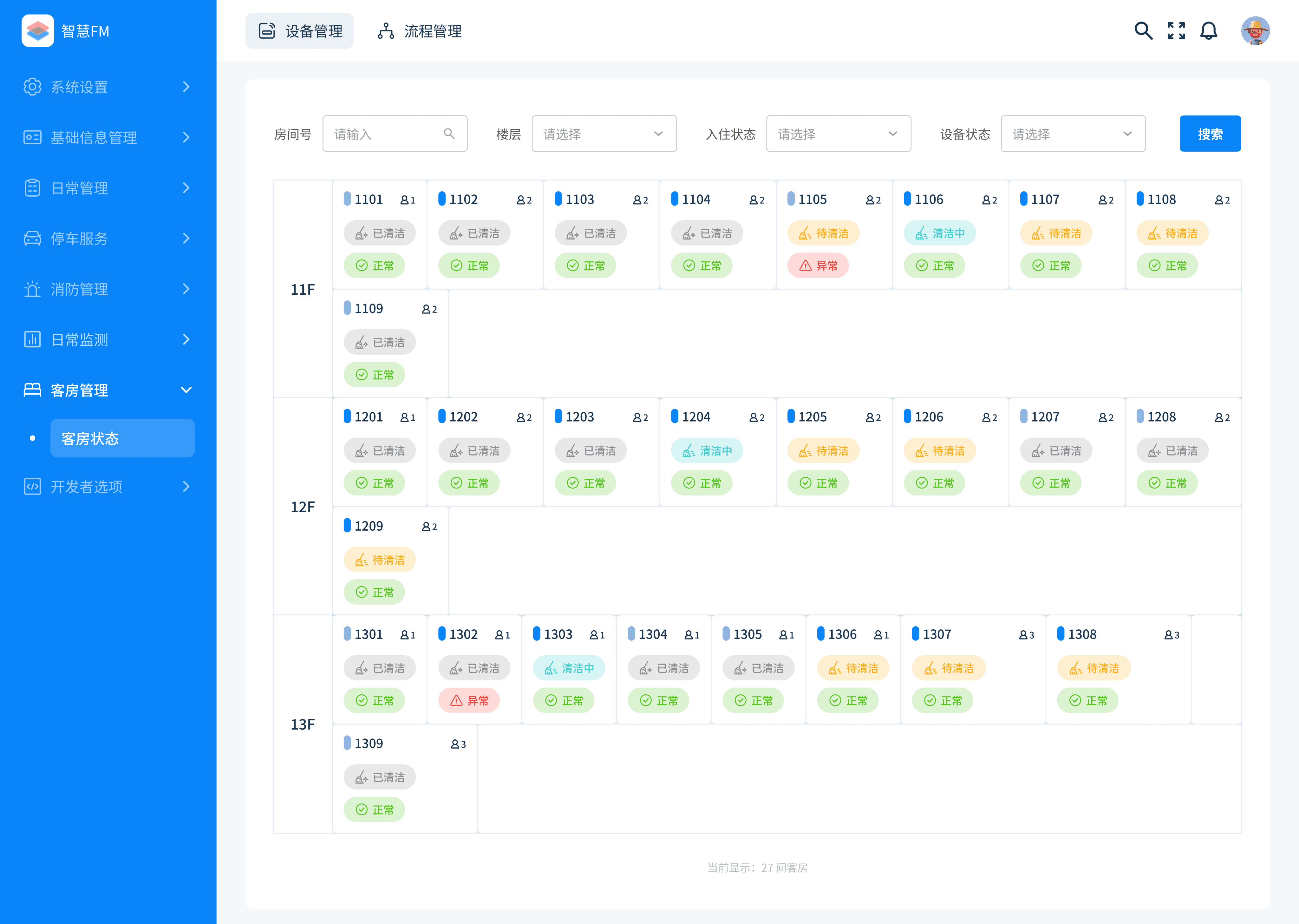 组件库:使用状态标签组件统一展示房态与设备状态;使用卡片组件展示客房简要信息,在结构和交互上结合实际场景进行定制。