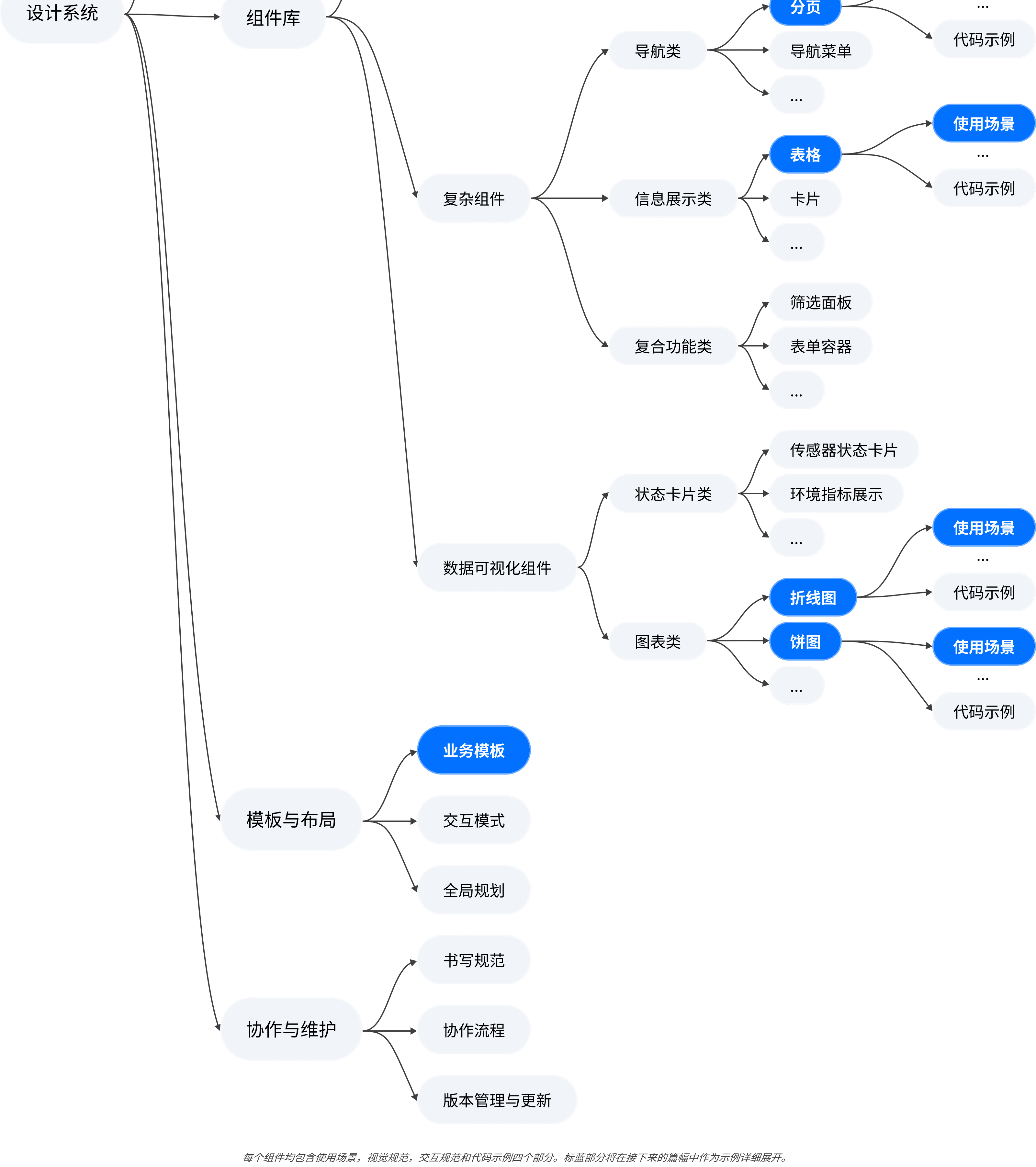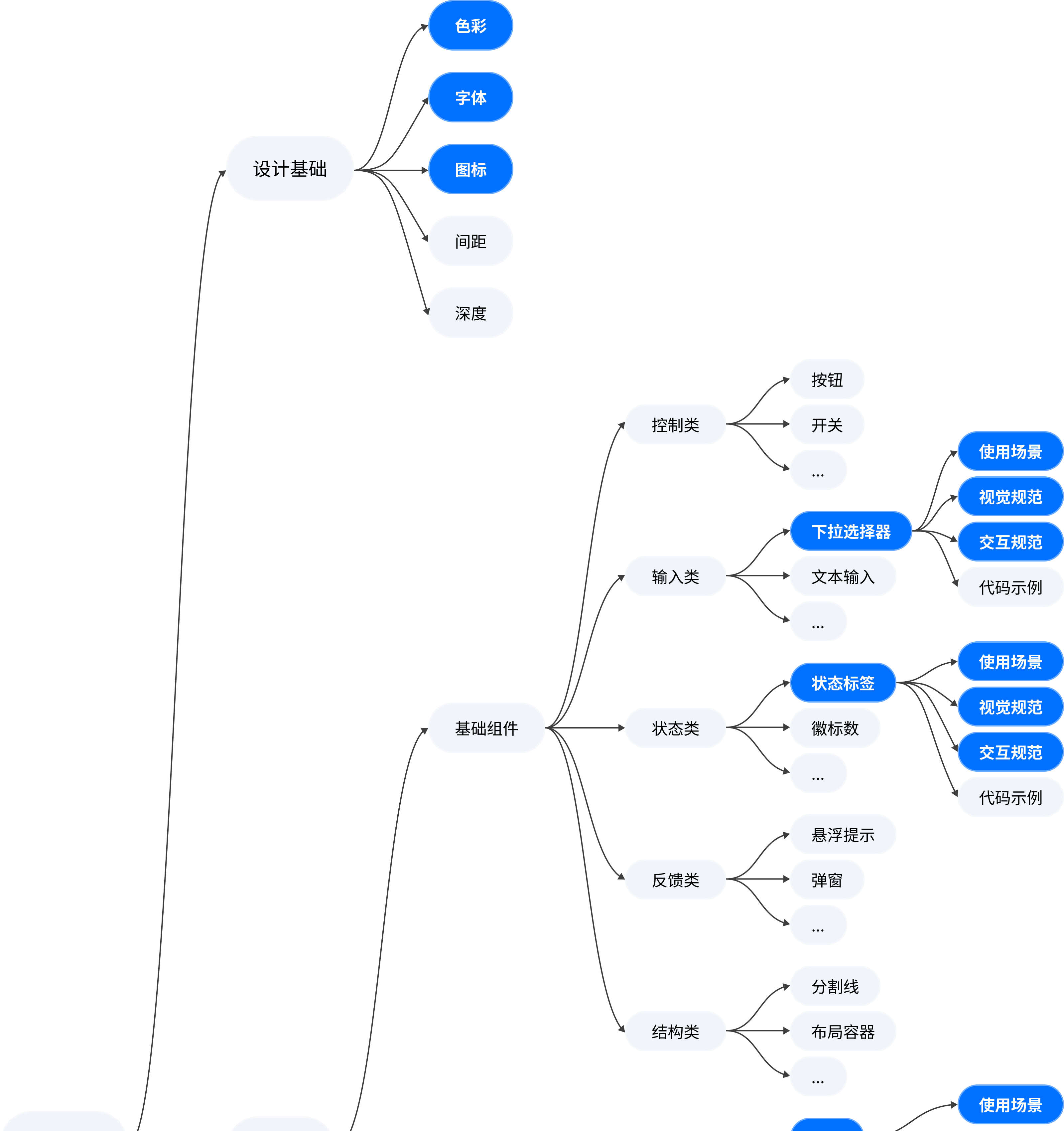 综合上述一手调研中发现的问题与各方提出的需求,以及对B端设计系统的相关研究,我决定采用混合结构来构建智业云平台的设计系统。考虑到平台存在视觉缺乏统一性、交互模式多样、业务结构复杂等问题,混合结构能更好地应对这些挑战。混合结构将结合层级型、任务型和代码型设计系统的特点,以满足不同职能团队的需求,并提升整体的可维护性和一致性。层级型有助于设计和开发团队从基础组件逐步构建页面,提升设计标准化,减少重复工作。任务型则以业务模块为核心,为不同使用场景提供清晰的交互指导。代码型通过代码复用与动态更新,提升开发效率。清晰的系统结构也便于未来版本的动态更新,确保团队在设计资产与产品优化上的同步协作。智业云设计系统的具体结构将如下: