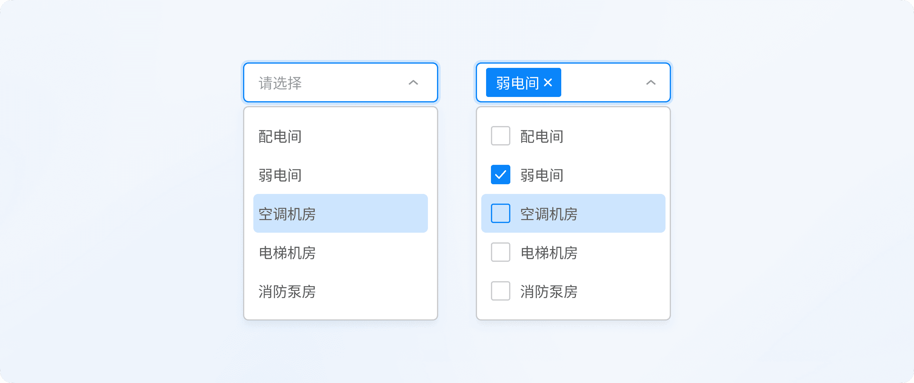 适用于在多个选项中选择一个或多个值,适合在选项数量较多时(大于4项)使用,以节省界面空间。当选项数量较多时,可搭配搜索功能使用。该组件常用于过滤器、设置面板、表单等场景。