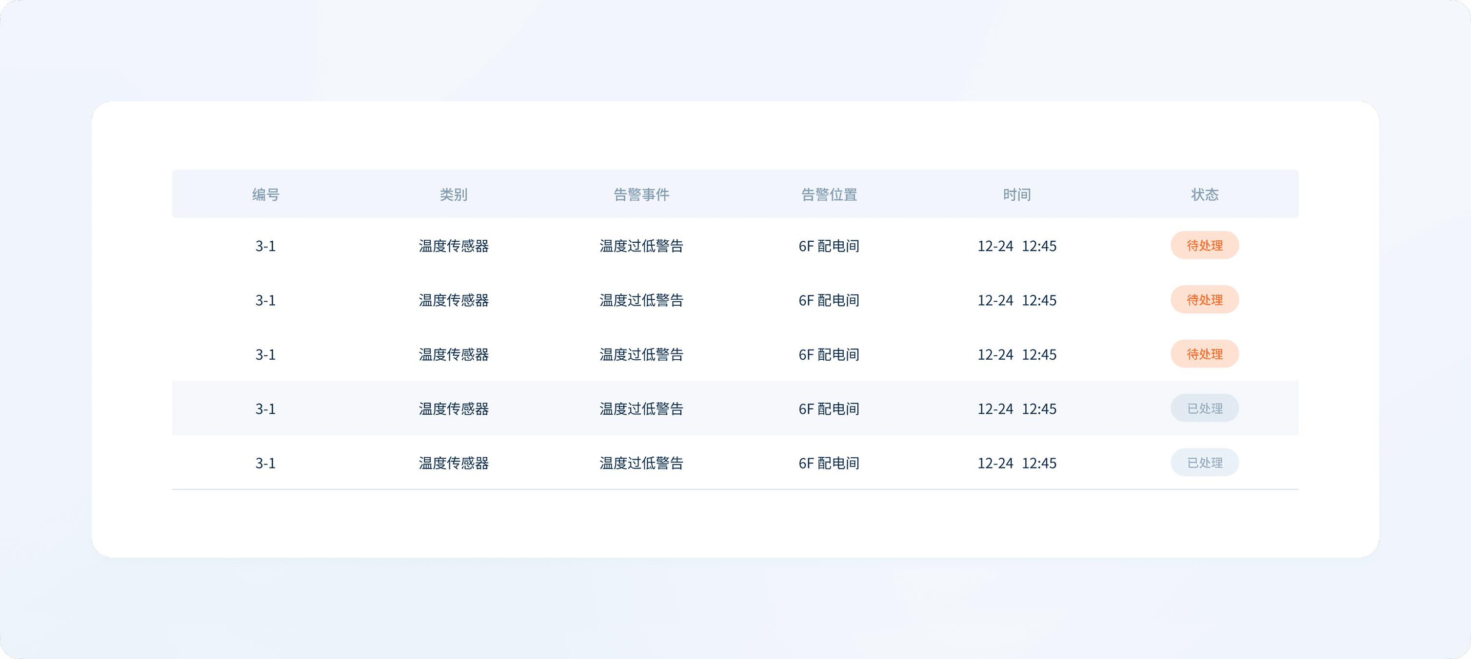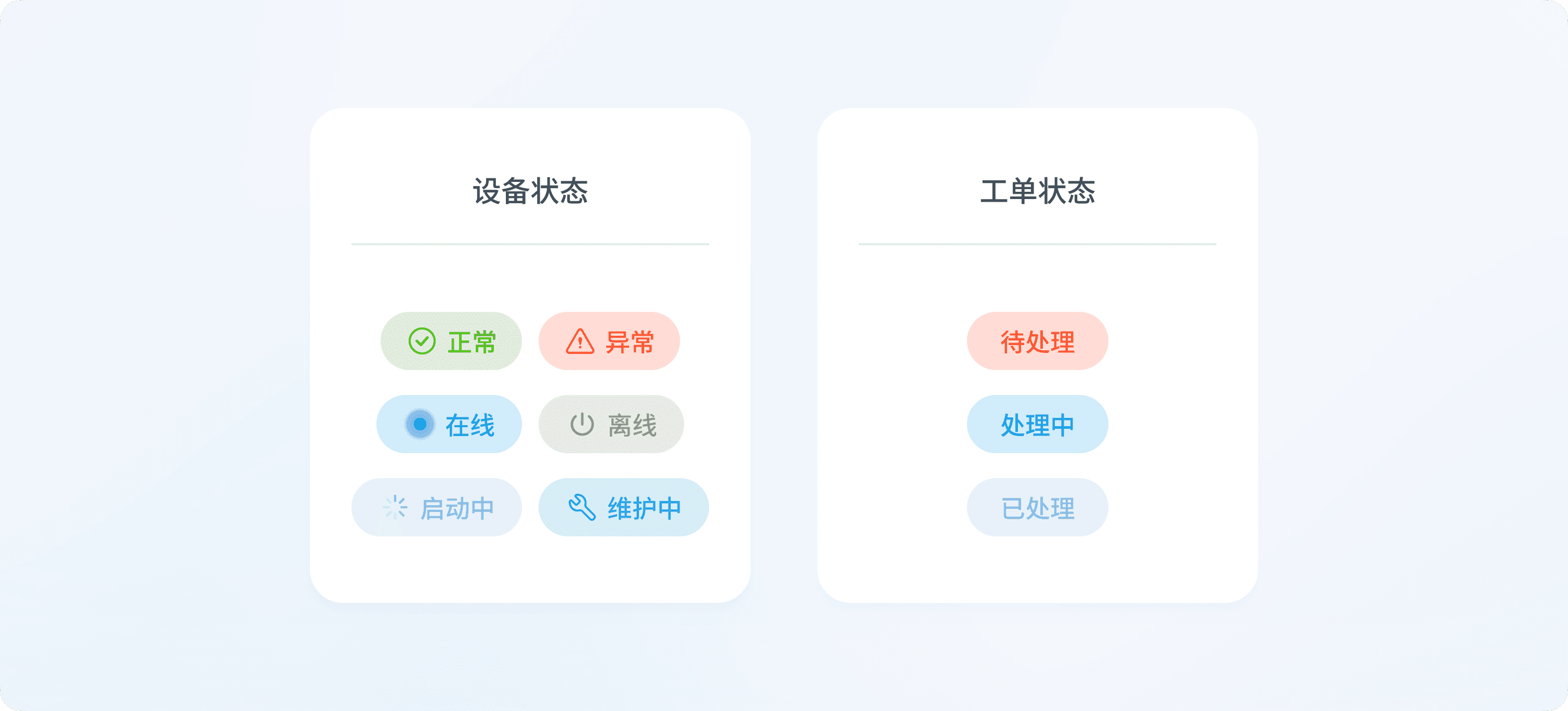 状态标签用于快速传达展示对象的实时状态,帮助用户高效判断运维情况与处理优先级。主要分为四类:设备状态、告警状态、工单状态及能耗状态。该组件常用于表格、卡片、监测看板等场景。