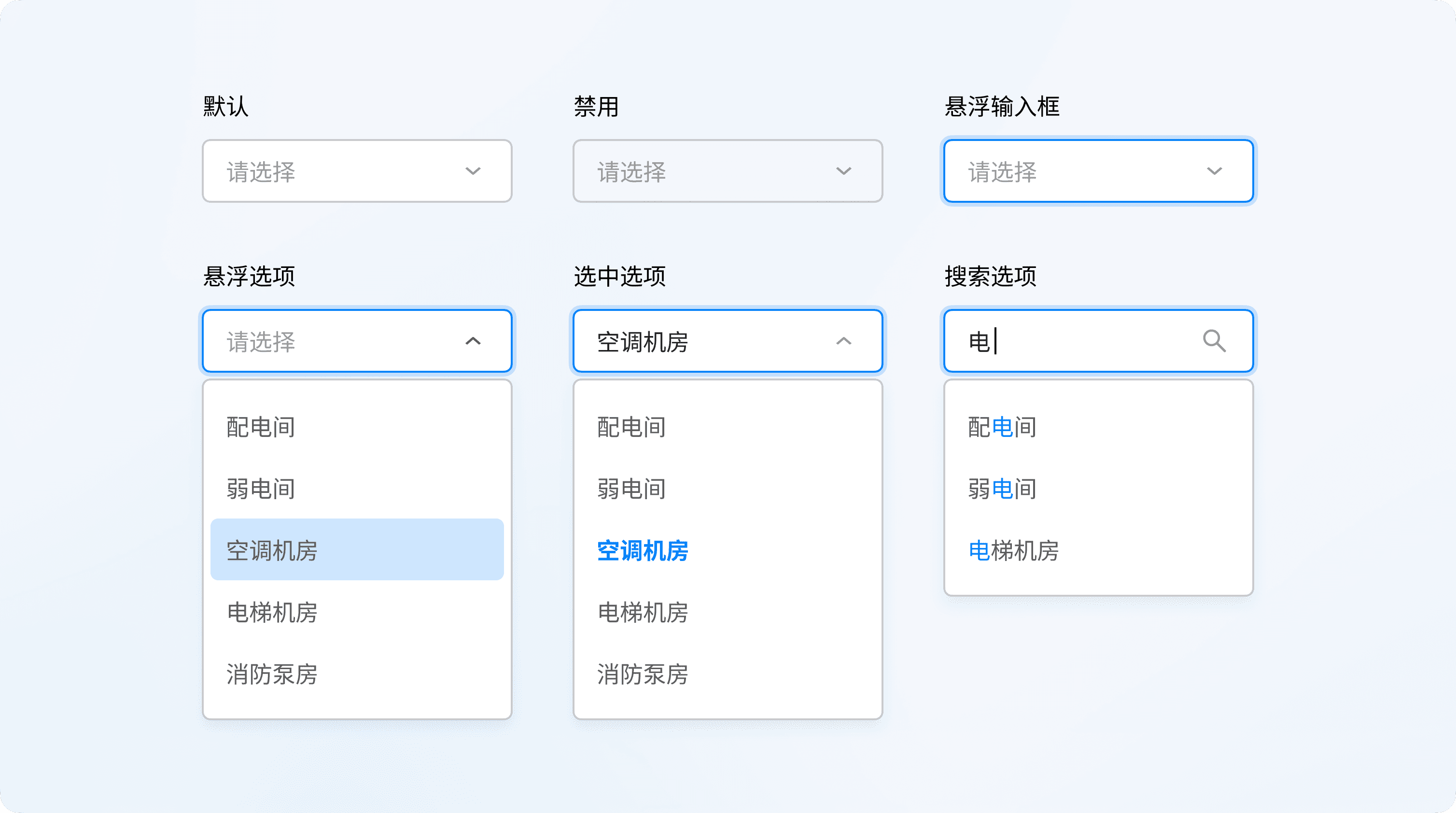 为避免篇幅冗长,本节从基础组件、复杂组件与数据可视化组件中各选取2个具有代表性的组件展示,共计6个。其中,下拉选择器与状态标签将详细展示其使用场景、视觉规范与交互规范,其余组件则以图文简要呈现其核心要点。