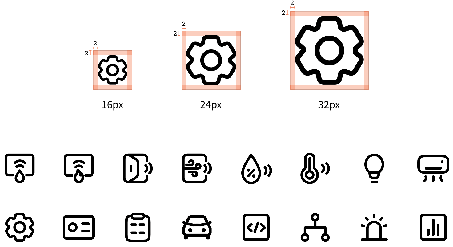 图标采用线性风格,契合品牌简约、理性与科技感的气质,默认线宽为 1px,确保在不同尺寸下清晰呈现。考虑到平台涉及大量物联网监测场景,设备类图标较多,同类图标在构造上注重统一性,以增强整体识别度与系统性。