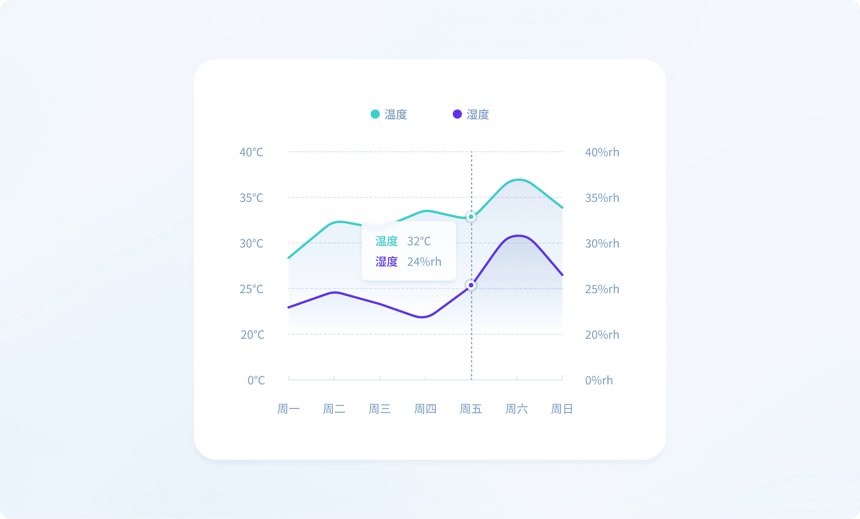 展示数据在连续时间序列中的变化趋势,适用于需要对数据走势、波动、对比进行分析的场景,例如:设备运行状态的连续监控数据 ,温湿度的时间变化等。