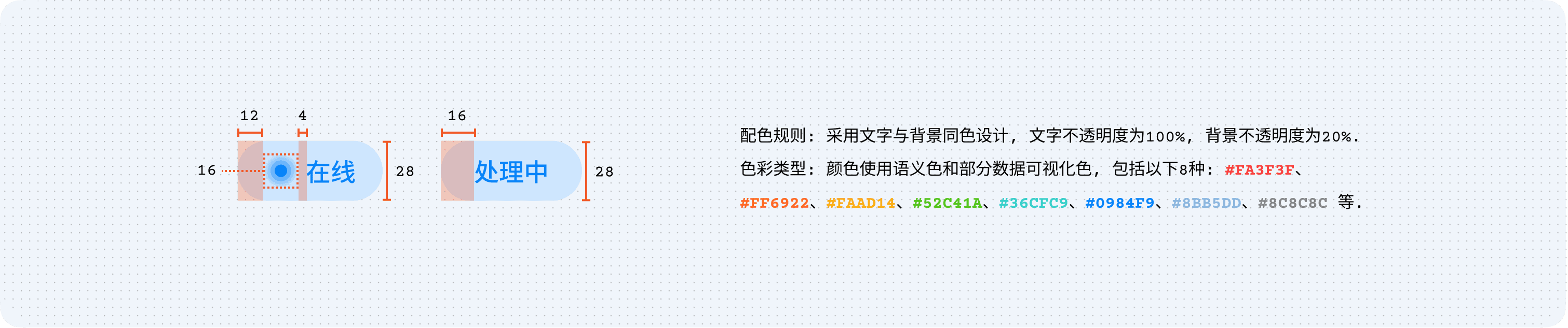 状态标签分为含图标版与纯文字版两类。为确保在不同界面一致性,统一规范其尺寸、间距及图标等视觉规范。