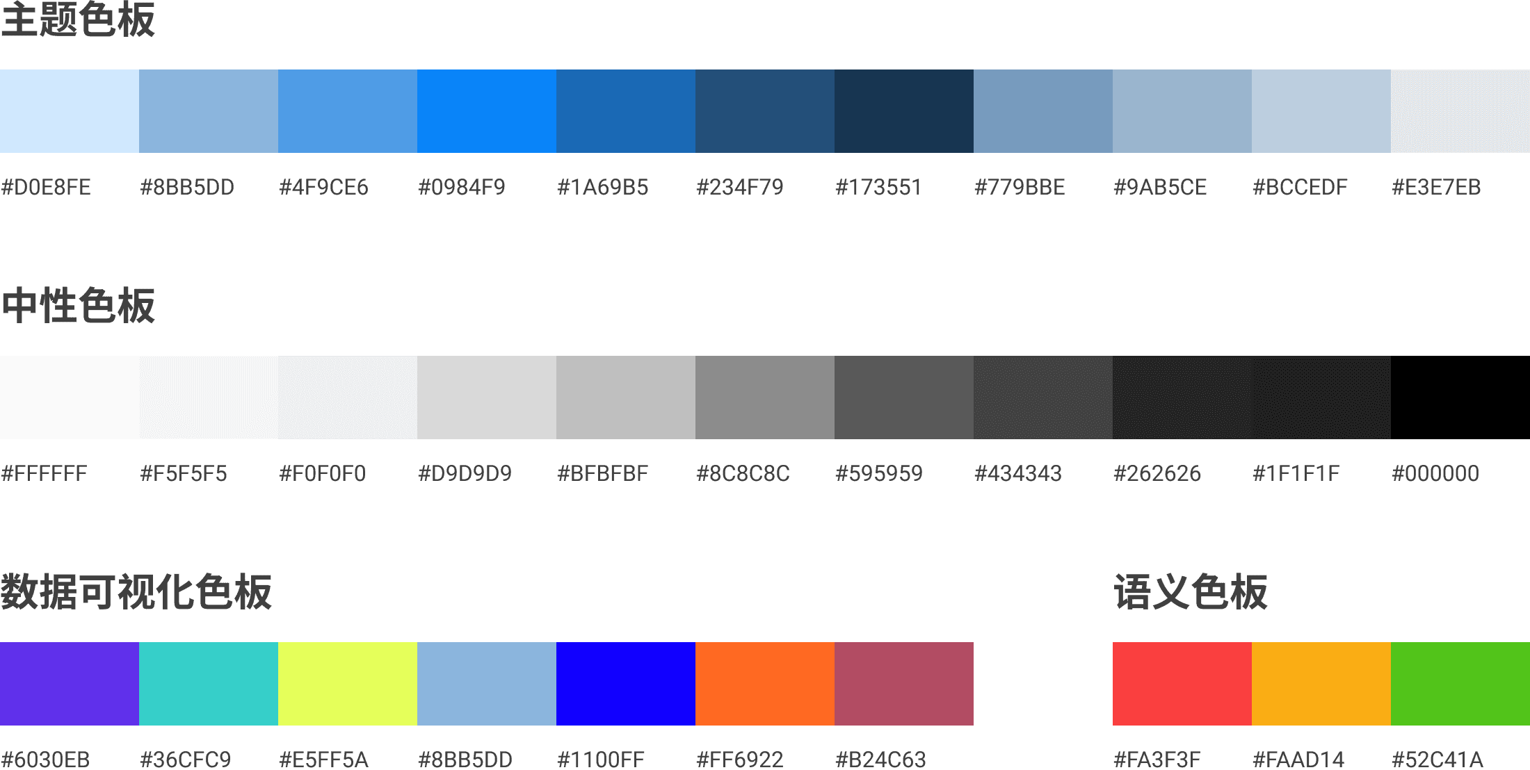 色彩体系以品牌 LOGO 中理性、稳重的科技蓝作为主题色,并在相近的饱和度与明度范围内延展出统一的主题色阶。中性色涵盖黑、白及不同层级的灰色,合理运用中性色有助于强化界面信息的主次关系。数据可视化配色围绕智能高效的主题,从不同色相中延展出高区分度的色板,用于增强表达的辨识度和专业感。语义色遵循通用标准,选取红、黄、绿分别用于错误、警告与成功状态的传达。