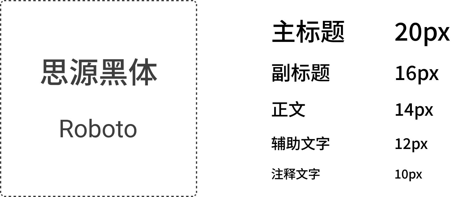字体选择了高适配性的系统默认字体——思源黑体与Roboto,以确保在多终端环境下的稳定呈现。字体共设定 5 个层级,覆盖标题、正文及辅助信息等不同使用场景。