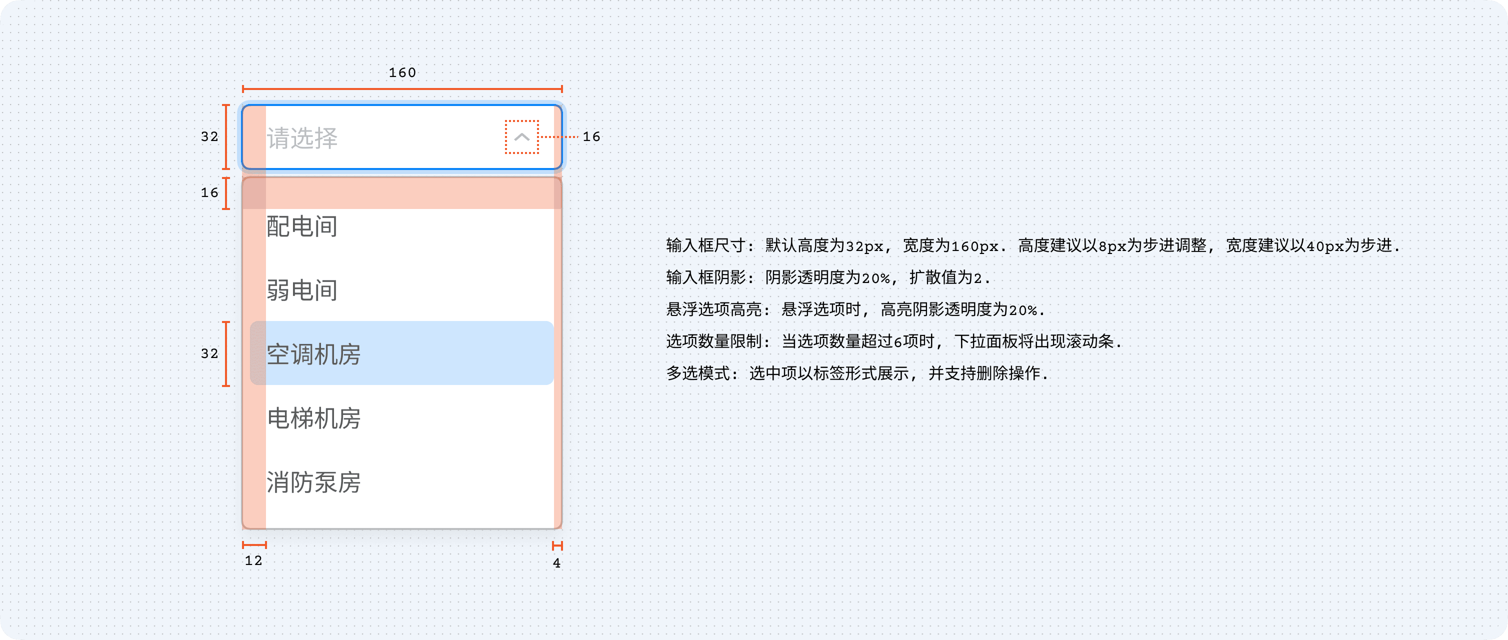 为了确保下拉选择器在不同界面的一致性,在这里明确其尺寸、间距、配色和图标等视觉规范。