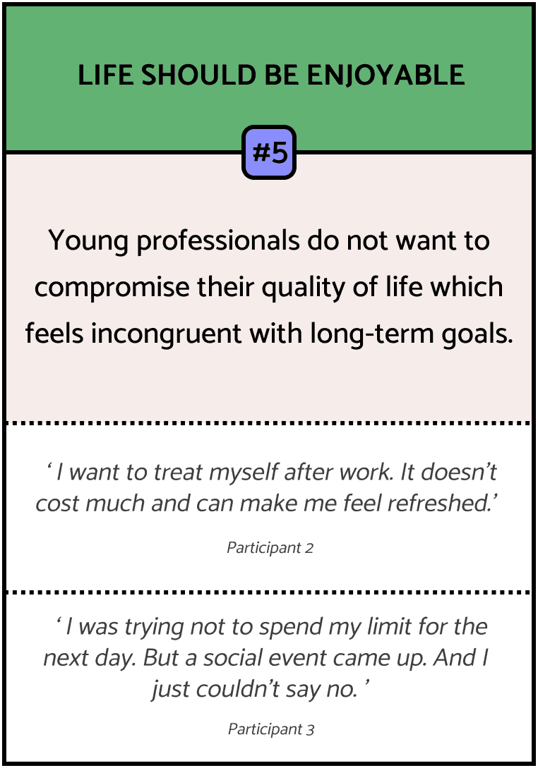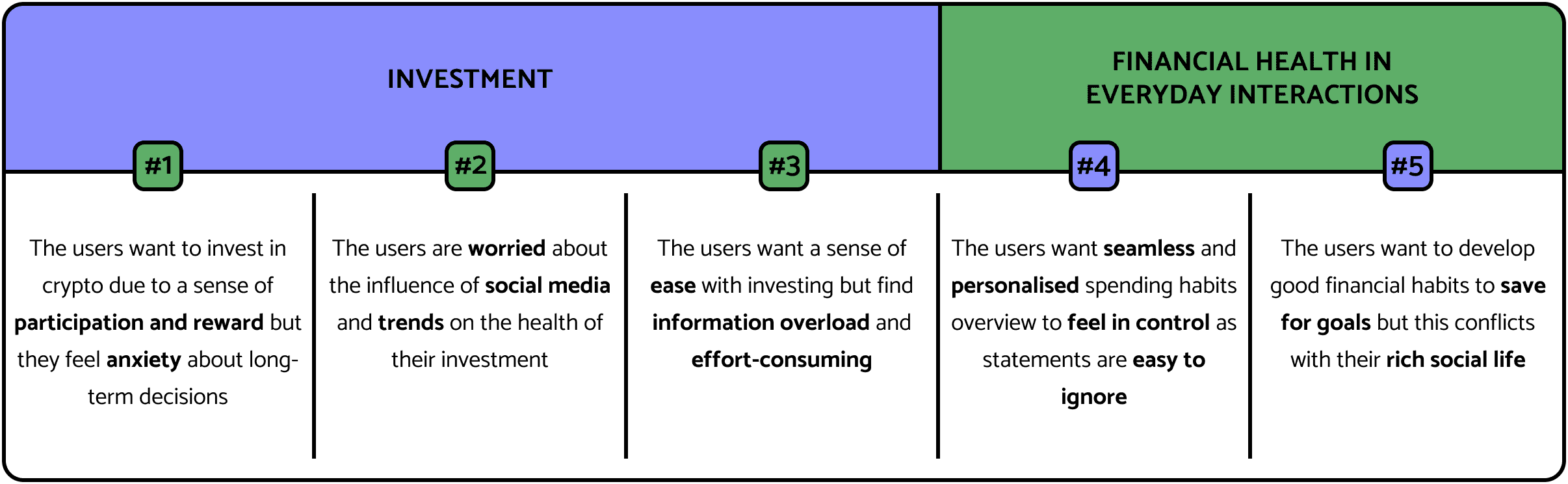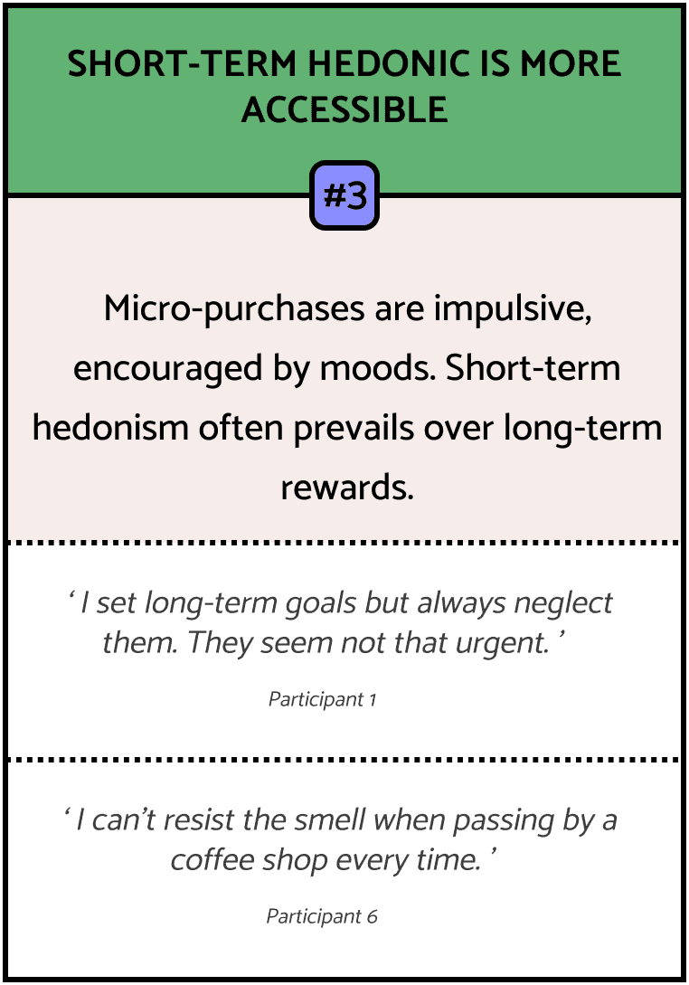 The unreachable pay-off feeling, the pile-up of micro-purchases and the conflict with hedonism all hindered users from starting or persisting in working towards their long-term financial goals. Facing all the dilemmas, we found the opportunity. The question mark lingering in our mind evolved from the initial question brought up by Capco to a more specific one.