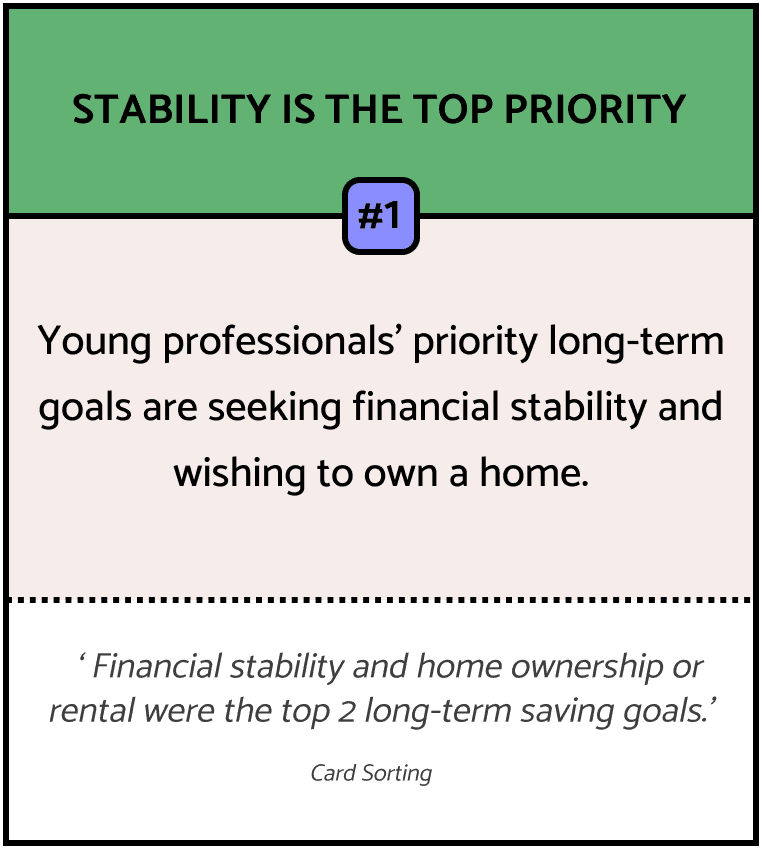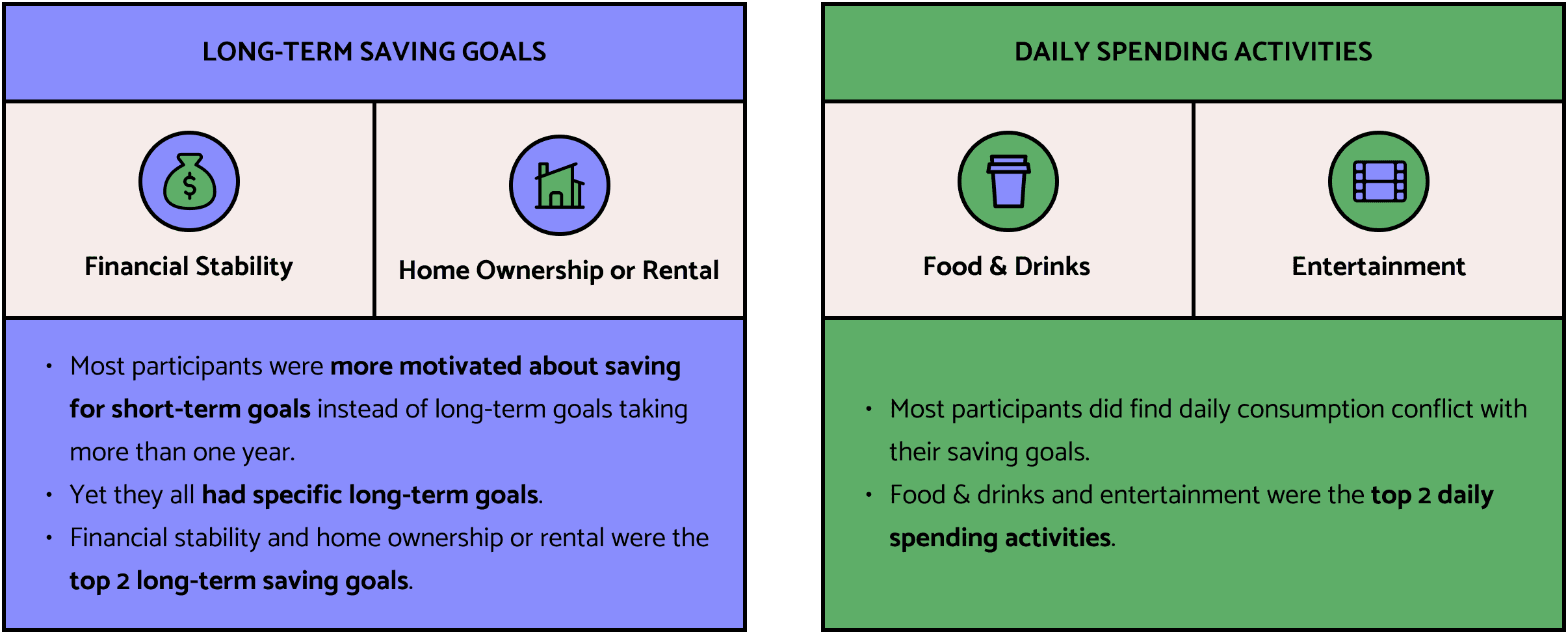 We chose Card Sorting to carry out the primary research. The options were shown with images and captions instead of only text. The images worked as prompts for the participants which made the activity more engaging while improving the efficiency of deciding between the options. Then we used a statistical method to speed up the process of analysing data from the 10 participants. This research let us intuitively understand the top saving goals and daily consumption activities of the users. We found that: