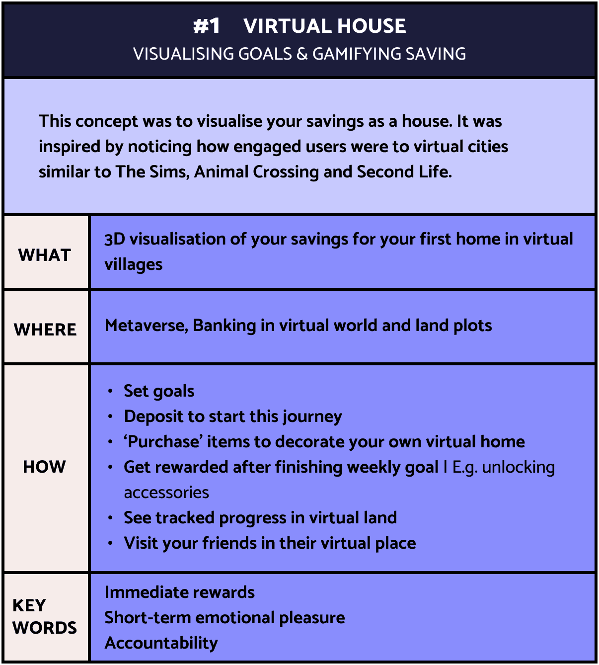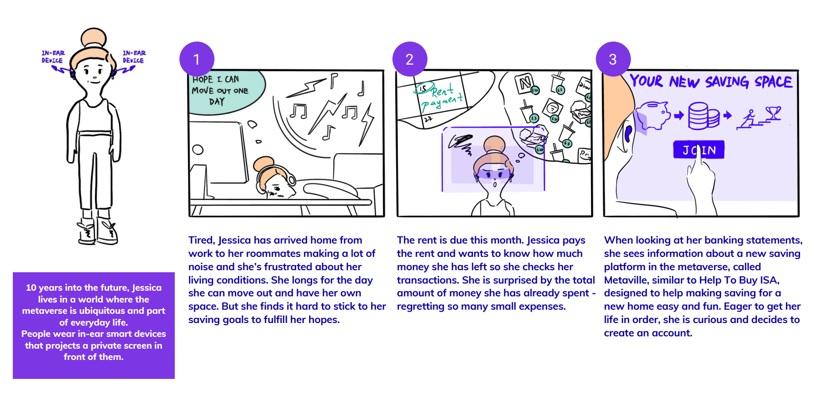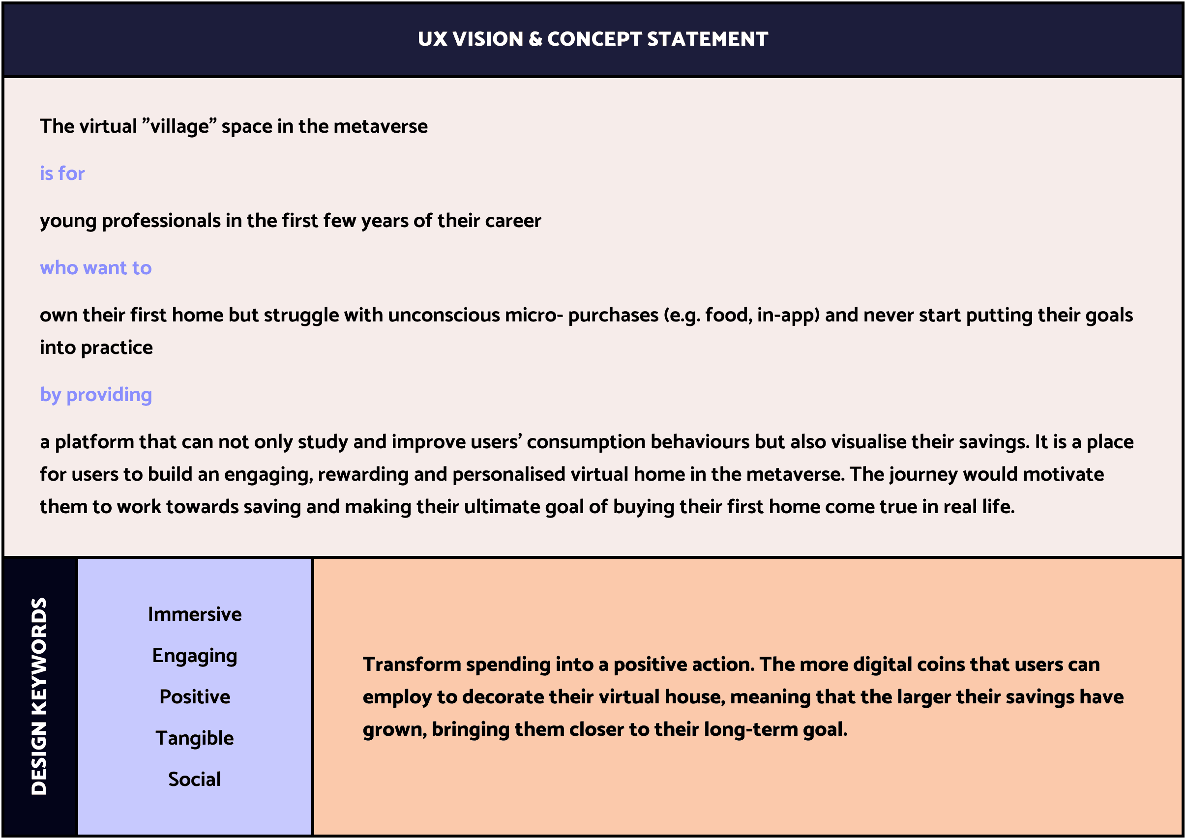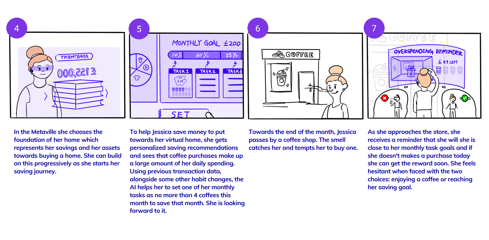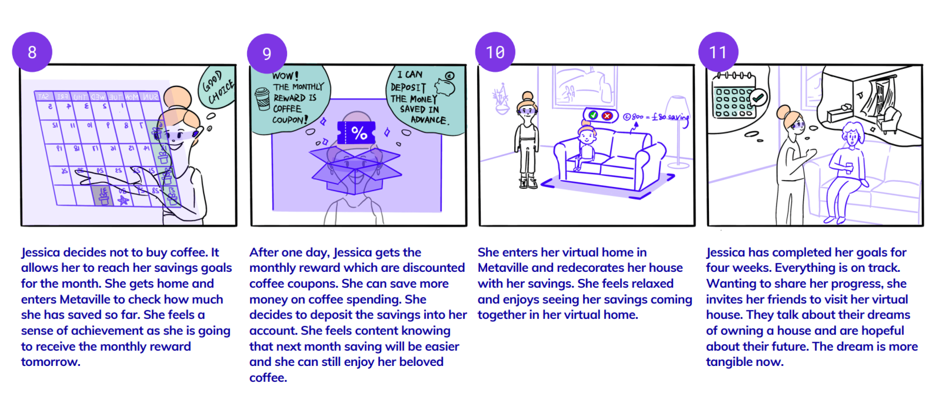 From body-storming, we reconsidered the trigger that prompted our character Jessica to use the product. We also confirmed wearable equipment and VR headsets as our main touchpoints. Some mechanism was adjusted, such as the timespan of goal setting and reward receiving and the frozen term of the deposit saving. Finally, we came up with a name for the product. We called it Metaville.
