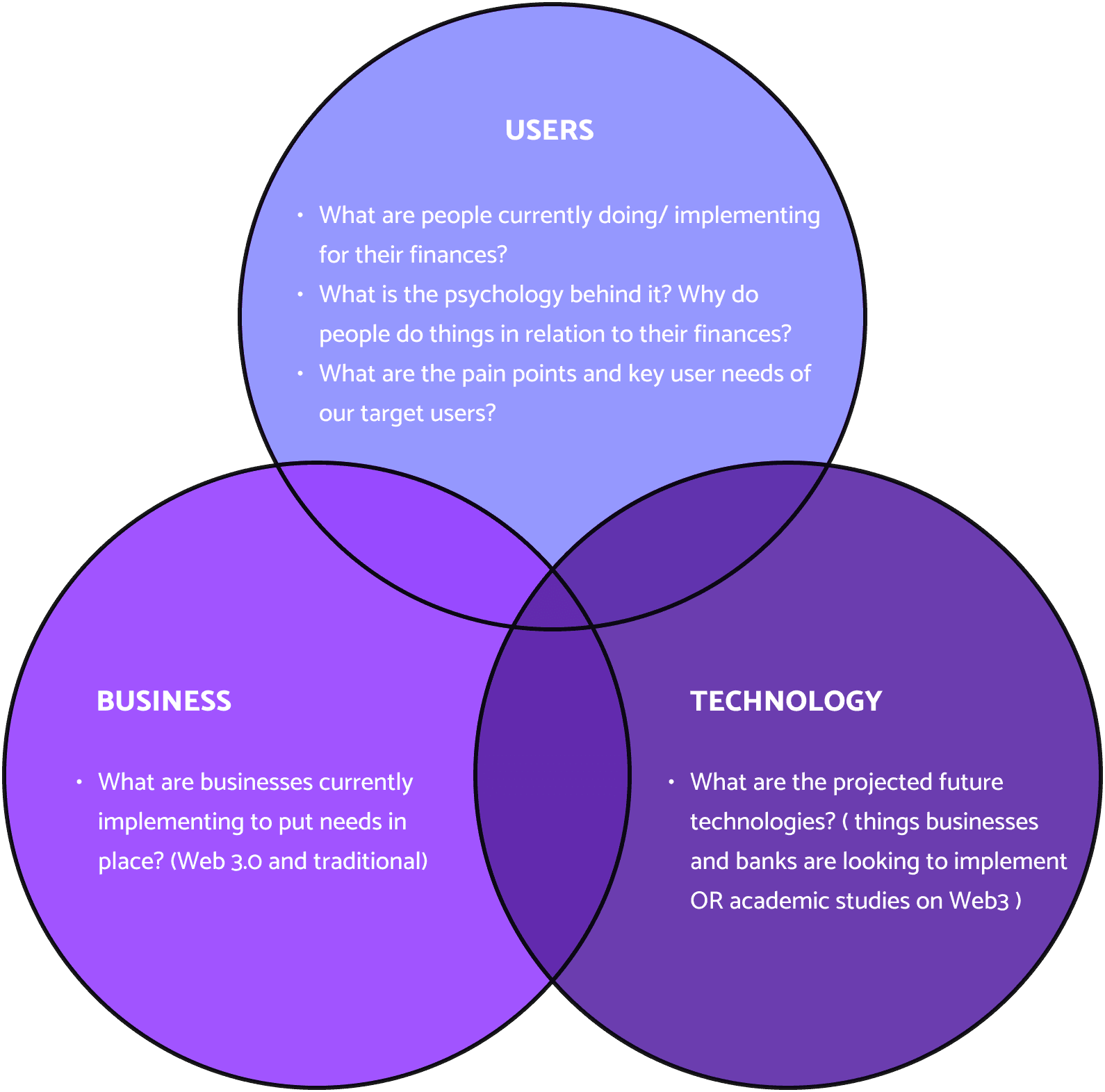 Without possible research direction, we started our discovery by brainstorming the potential user groups and financial challenges. Then we used 5W1H to unpack our assumptions. After discussion, we decided to focus on young professionals aged between Millennials and Gen Z to carry out initial secondary research to get more background information. We chose these groups because they faced overlapped financial challenges, tended to embrace Web3 and they were highly accessible to collect data throughout the project.