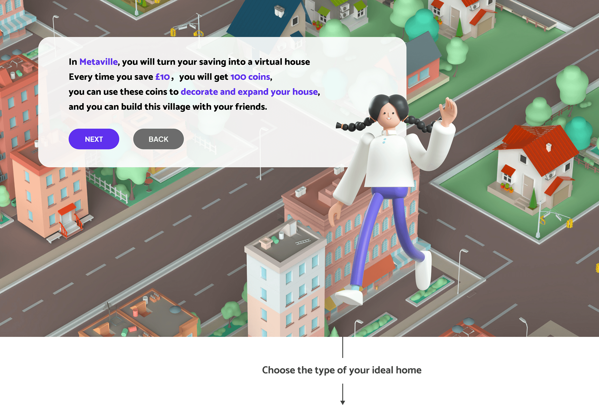For users who want to save for other long-term goals such as buying the dream car, saving for a wedding or planning towards a holiday. We will develop Metaville by creating an equally visually engaging experience related to other saving goals. This will add further value towards customer engagement with our service and broaden the scope for expanding our stakeholders.