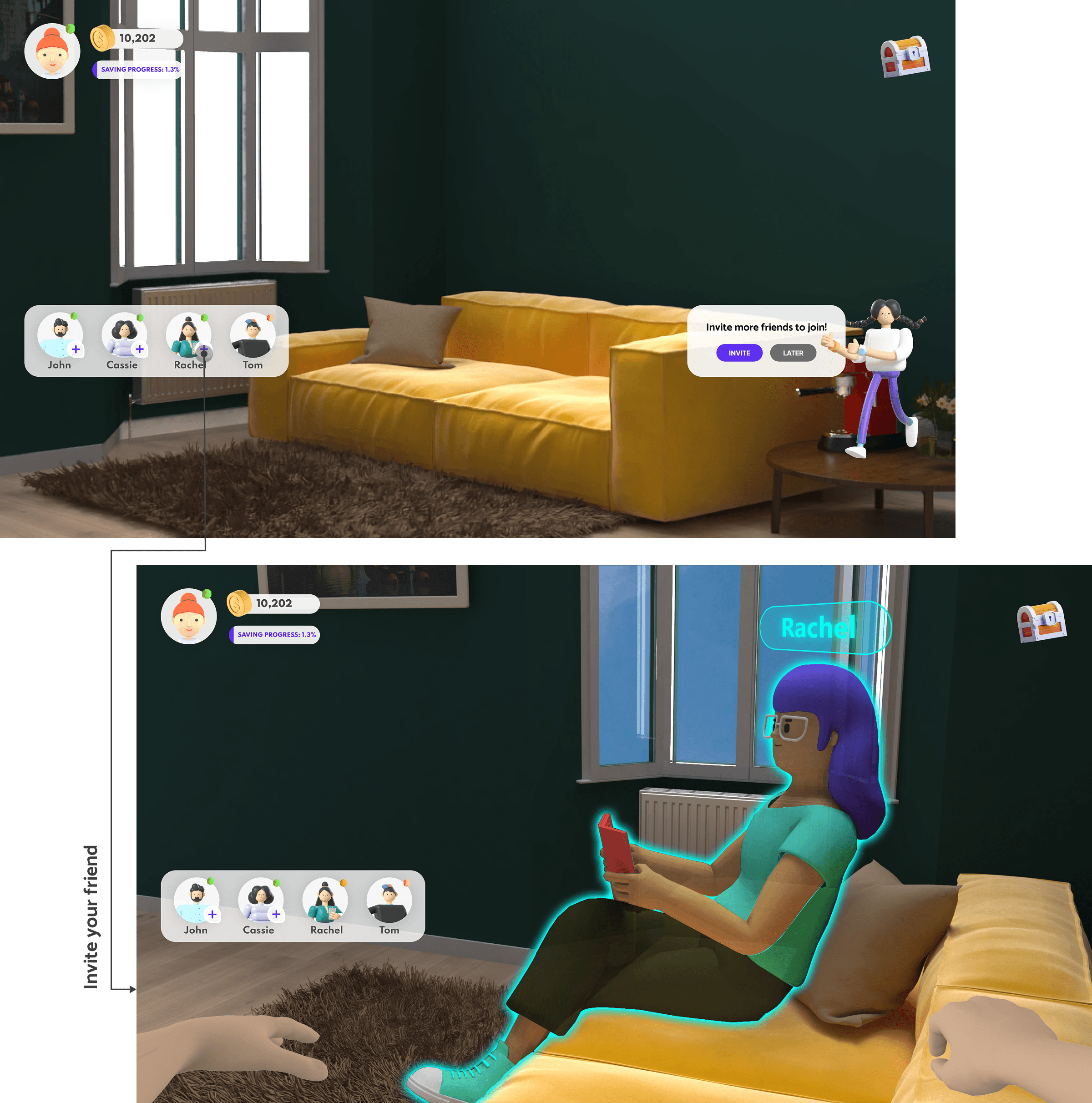 After discussing the pros and cons of the two concepts, we decided to integrate part of MR financial assistant features into the virtual house to reinforce the concept and expand the usage scenarios. We completed the UX vision as the overall roadmap to follow.