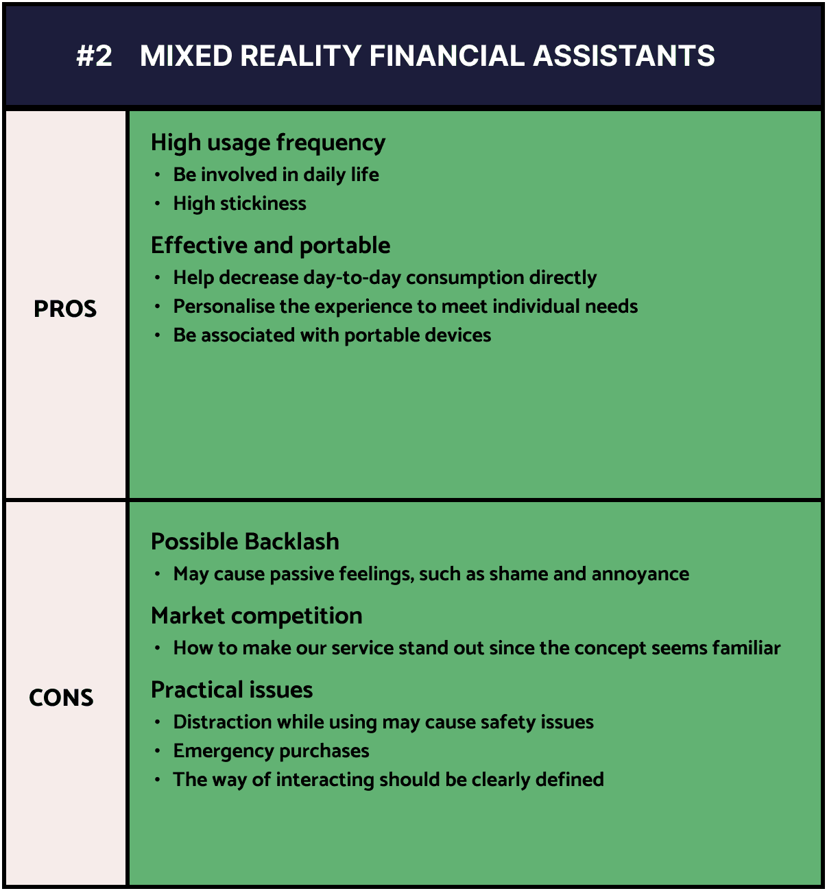 Instead of overdoing some features, how to balance among the user goals and user experience is important. Excessive reminders from the mixed reality financial assistant may be annoying for users and then be ignored. In a long-term vision, it could make the users lose confidence in the service.