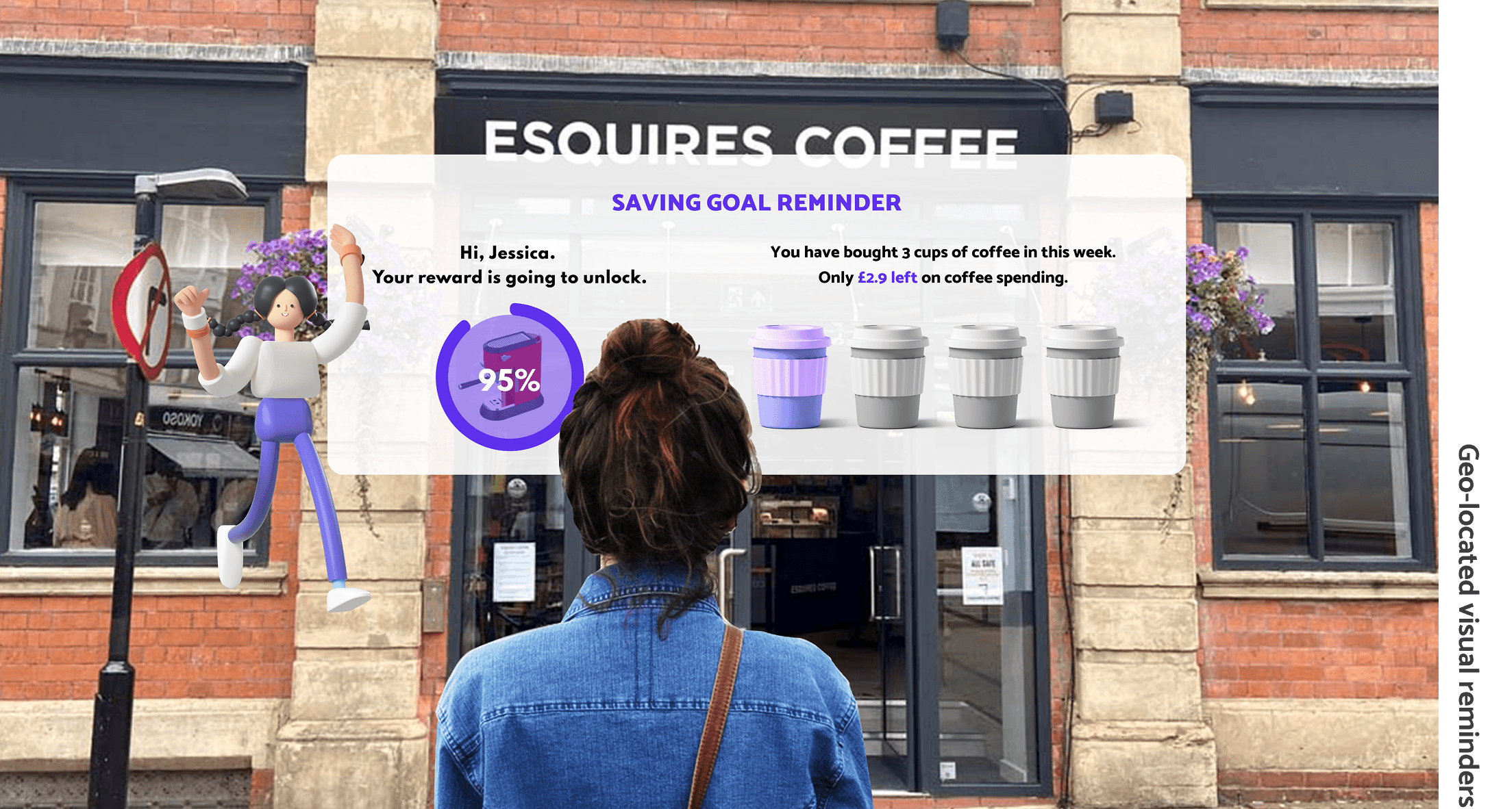 The final user test was body-storming with our participants. This time we did the body-storming in a more realistic context such as in a real coffee shop and one of the group members' own home. The feedback was overall very positive. We only got one advice, but a brilliant one. The participants expected a mixture of virtual and real-life rewards. The group came up with the idea that real-life rewards could be personalised based on users' spending habits. For example, for our character Jessica a coffee coupon could provide strong motivation. The idea also coincided with the theme of Metaville.