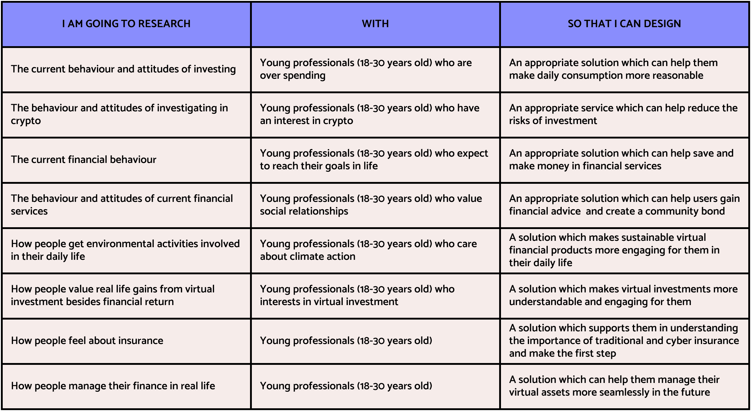We planned to conduct semi-structured interviews to better understand our target users and identify a more specific direction for the project. We collaboratively generated a list of questions based on the previous draft hunt statements. The questions were used to get a basic idea of the current practices of the young professionals regarding financial habits, values, opinions about Web3 technologies and any pain points suffered.