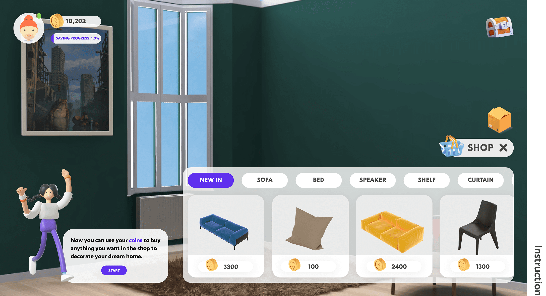 Although the features listed were informative, the group found that there were cognitive gaps between each other. Some members wondered how to deposit savings, how to set a goal and what if users failed to the staged goal. Some felt uncertain about the game logic in detail, such as the exchange rate between the real savings and game coins. The other was concerned about how to price the digital furniture since it would be inconsistent with reality if the price was low or the users would feel less motivated to continue if the price was high. So we used flowcharts to clarify our user flow, determine the game mechanism and check if any details were missing in different scenarios. It enabled the group to be on the same page and be more confident when facing questions from the clients and users later. After the practice above, we finally finished the story scripts and the draft storyboard.