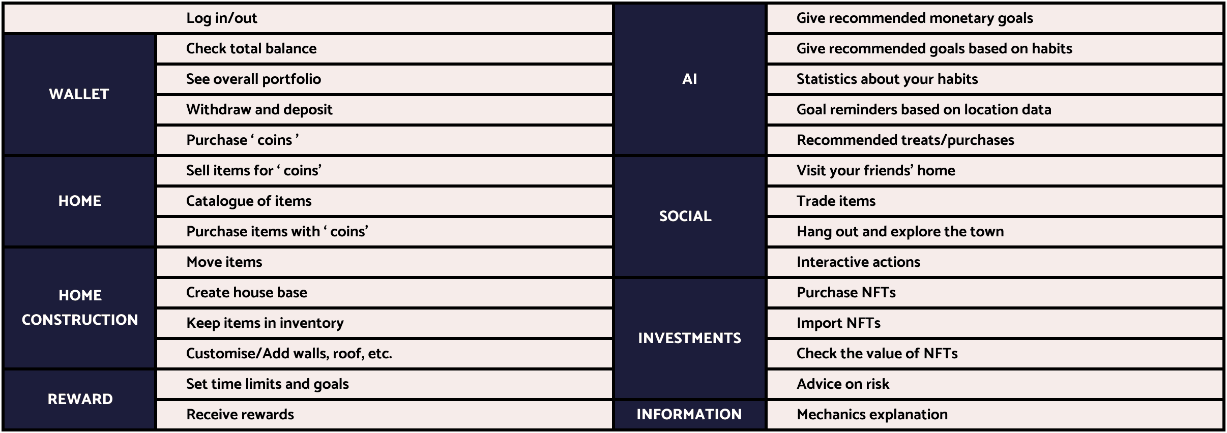 As our concept is a combination of product and service, we used a service blueprint to comb the steps for using our product. This also covers all the features of our product. Doing the service blueprint together enabled us to refine and list the detailed features. Although the target users have owning a home as an ultimate goal, the endpoint of the map is concerned with accomplishing staged goals like saving a certain amount every month. This is because saving enough for a home could take a very long time. We decided to focus on the initial stage of product development. We must define the scope of our project clearly due to the time limitation.