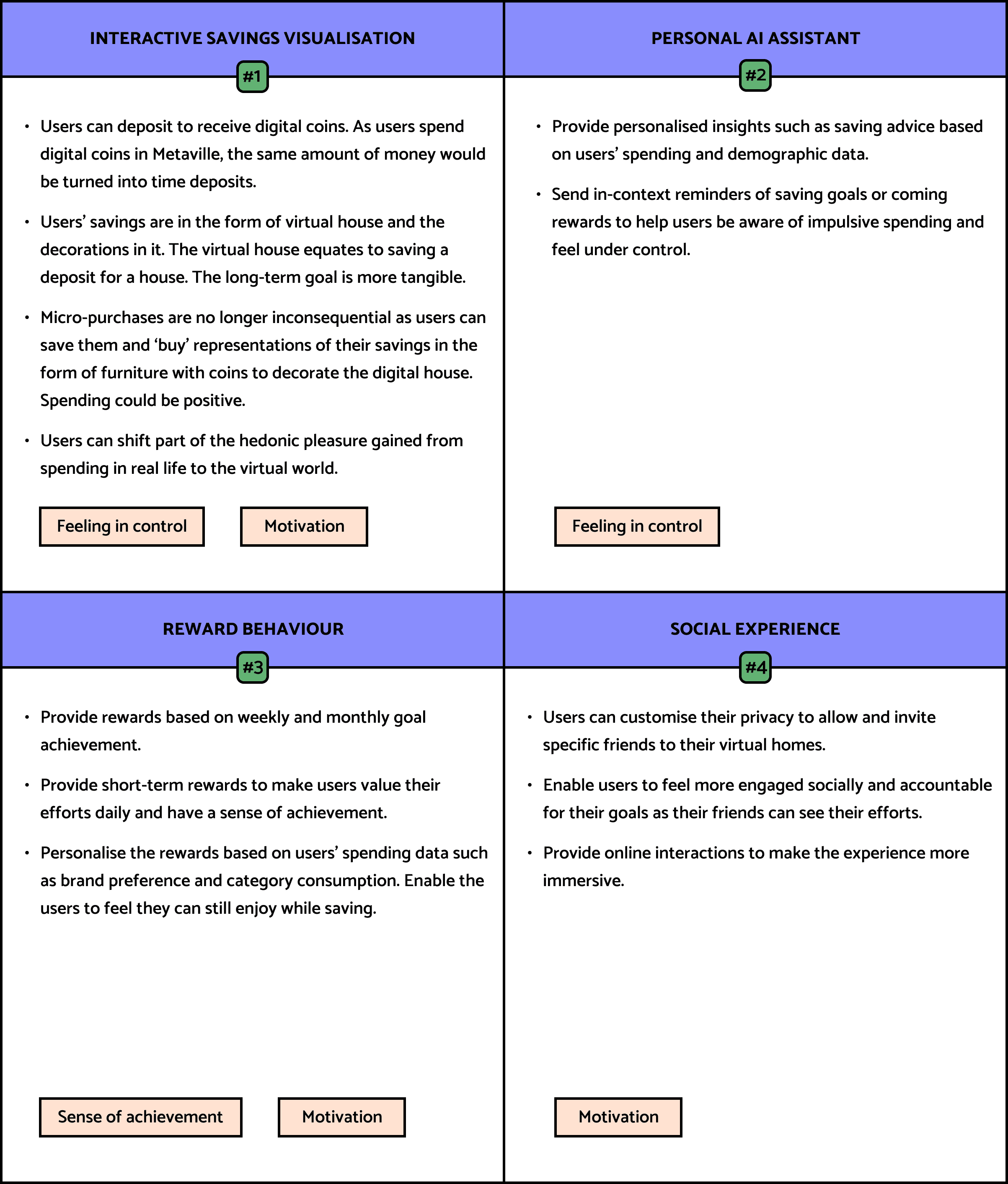 We picked out the key points and categorised the feedback into two groups, product feature and storyboard content. Overall, the participants could see themselves using the product and they responded well to the social features but the storyboard required clarity. There were plot sequence issues. More explanations were needed between steps. And the presentation of rewards and incentives needed to be strong. The participants also mentioned automatic depositing. Due to time limitations, we only revised the script of each shot based on the feedback instead of the whole drawing.